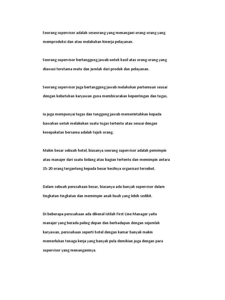 Supervisor Adalah: Pengertian, Wewenang, Gaji, Tugas,Fungsi from pengajar.co.id Superintendent adalah atasan dari supervisor. Diperlukan kemampuan teknis, manajerial, dan komunikasi interpersonal yang mumpuni untuk bisa bekerja pada posisi ini. Selain bertanggung jawab kepada manajer, supervisor juga bertanggung jawab memastikan staf yang bekerja di bawahnya bekerja dengan baik. Karena perkembangan pekerjaannya biasanya di dalam dan di luar perusahaan. Beberapa contoh supervisor adalah pengawas pemasaran, manajemen, produksi dan banyak lagi. Supervisor adalah seseorang yang diberikan kewenangan oleh pejabat di atasnya untuk memberikan perintah, mengawasi pekerjaan anak buahnya serta mengawasi dan memerintah pelaksana aktivitas produksi dan niaga sebuah perusahaan. Supervisor adalah seseorang yang diberikan tugas dalam sebuah organisasi perusahaan dimana mempunyai kekuasaan untuk mengeluarkan perintah kepada rekan kerja bawahannya. Seorang supervisor mengawasi dan mengarahkan beberapa staf di bawahnya dalam sebuah bidang pekerjaan tertentu, sebagai contoh supervisor lapangan, supervisor pendidikan, supervisor gudang, supervisor restoran, supervisor finishing, supervisor sipil.